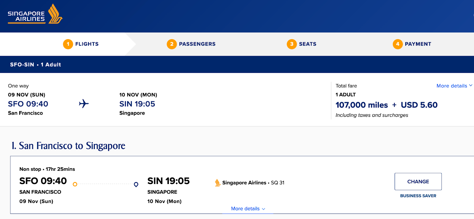 Business class flights can be incredibly pricey if you pay with cash, but redeeming miles for an award flight can result in significant savings. Here’s an example of an award flight from San Francisco (SFO) to Singapore (SIN) in a Singapore Airlines lie-flat business class seat for 107,000 Singapore miles and $5.60.