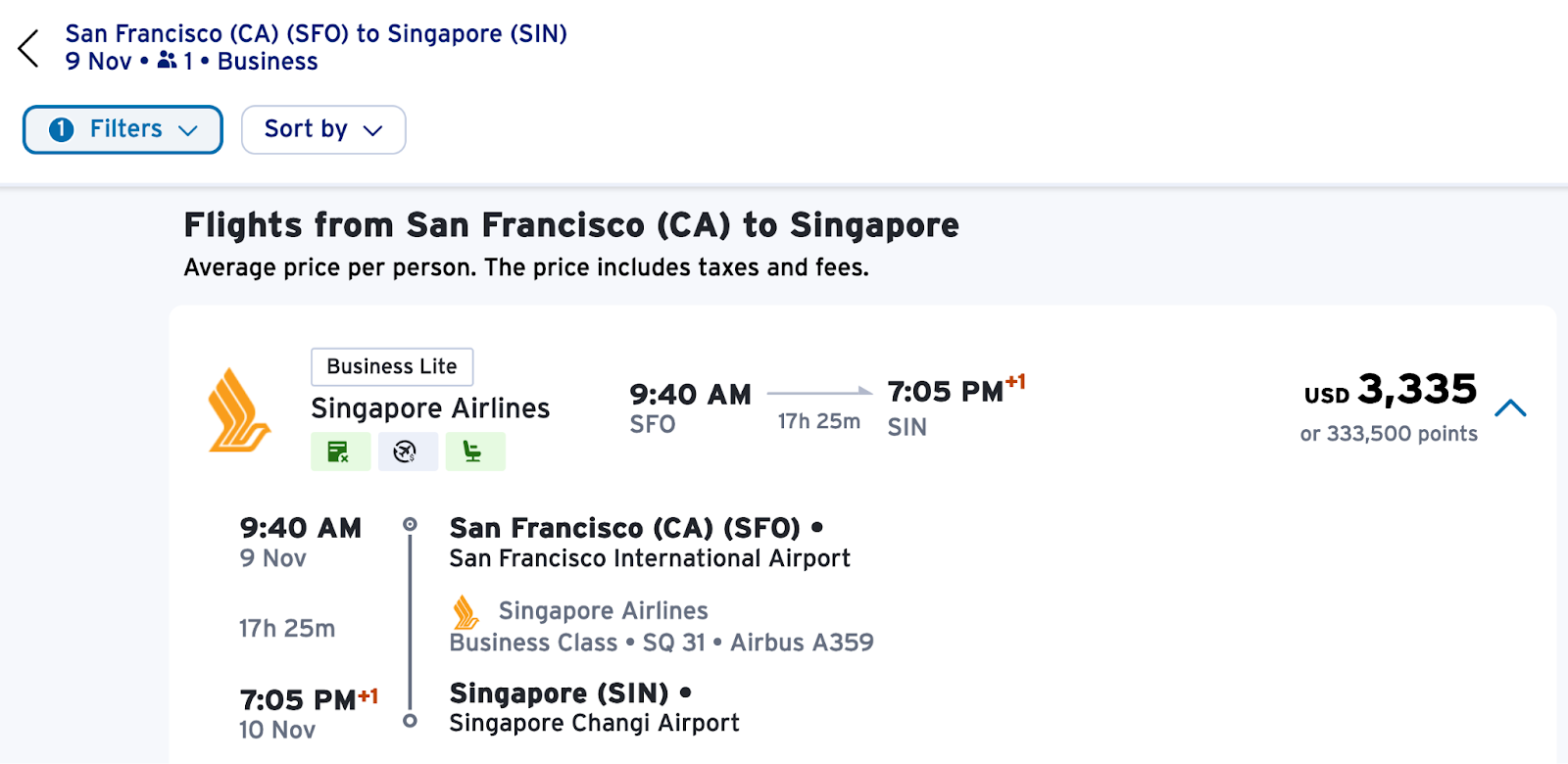Suppose you want to use Citi ThankYou points from your Citi Strata Premier ℠ Card for this flight. You’re better off transferring your Citi points to Singapore Airlines rather than booking through Citi Travel at 1 cent per point. The cash fare of the same ticket is a whopping $3,335, or 333,500 Citi points. That’s 226,500 points more than you’d spend if you transferred points to Singapore to book this as an award flight instead!