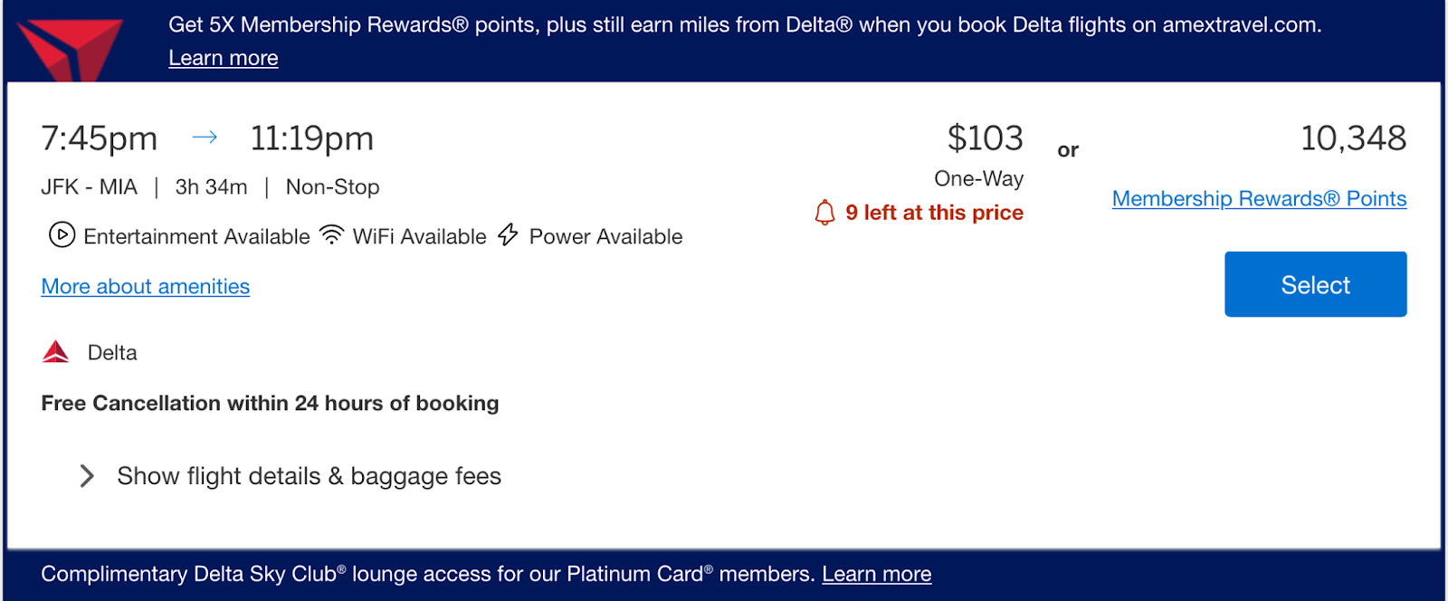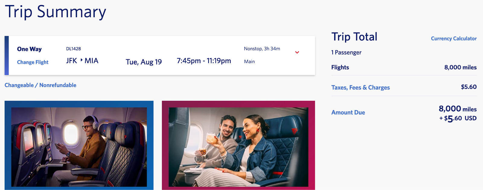 This can result in exorbitant pricing, but you’ll sometimes see relatively cheap flights as well. For instance, you could transfer 8,000 Amex Membership Rewards points to Delta SkyMiles to book the award flight below from New York (JFK) to Miami (MIA) — plus pay an additional $5.60 in taxes and fees.