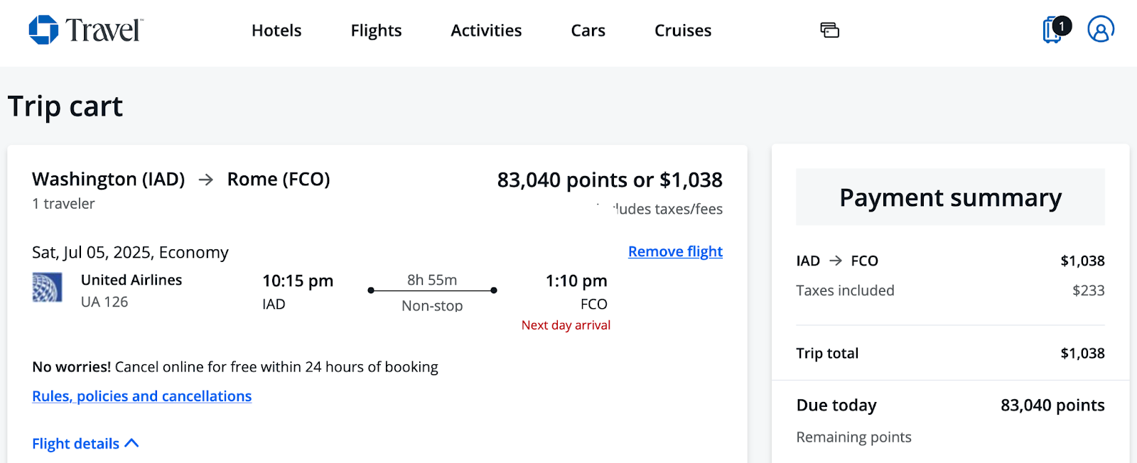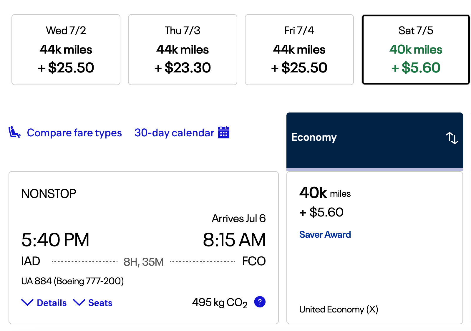 The same principle applies to international economy class flights, although the price difference might not be as significant. For example, if you’re planning a trip to Europe, you could book the United economy class flight from Washington Dulles (IAD) to Rome (FCO) below by transferring 40,000 Chase Ultimate Rewards points to United MileagePlus (with an additional $5.60 in taxes and fees).