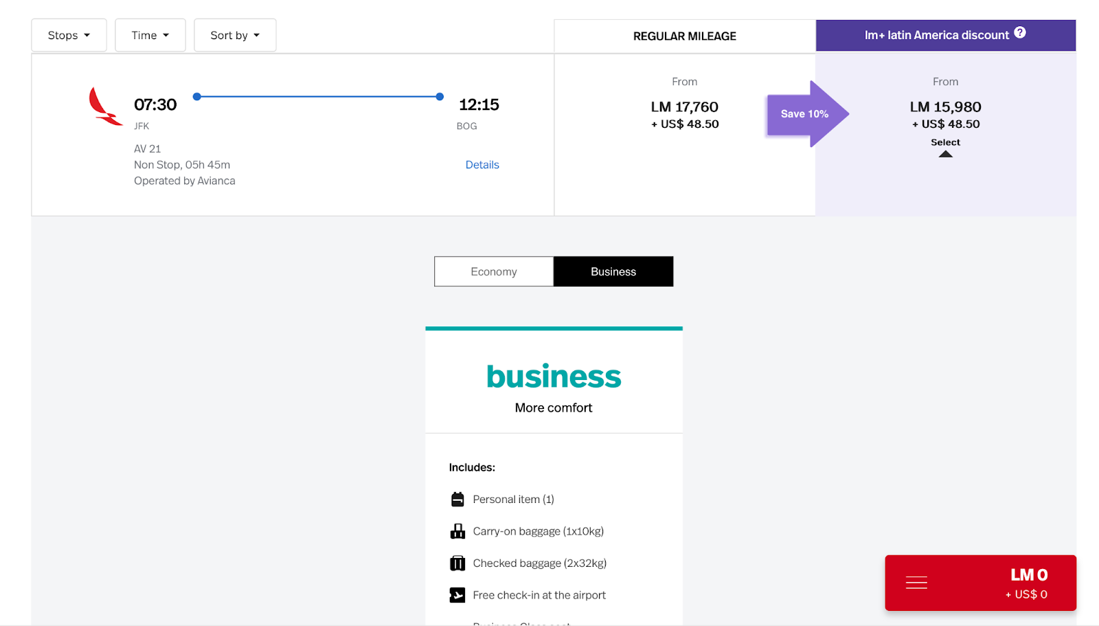 Then, you can select your flight. The prices shown are for an economy ticket. If you’re a cardholder of the Avianca Lifemiles American Express Elite card, you’ll receive a 10-25% discount. Select the business class option, then continue to checkout. This nonstop flight from New York (JFK) to Bogota (BOG) would cost 55,880 Lifemiles, plus $48.50 in taxes and fees in business class.