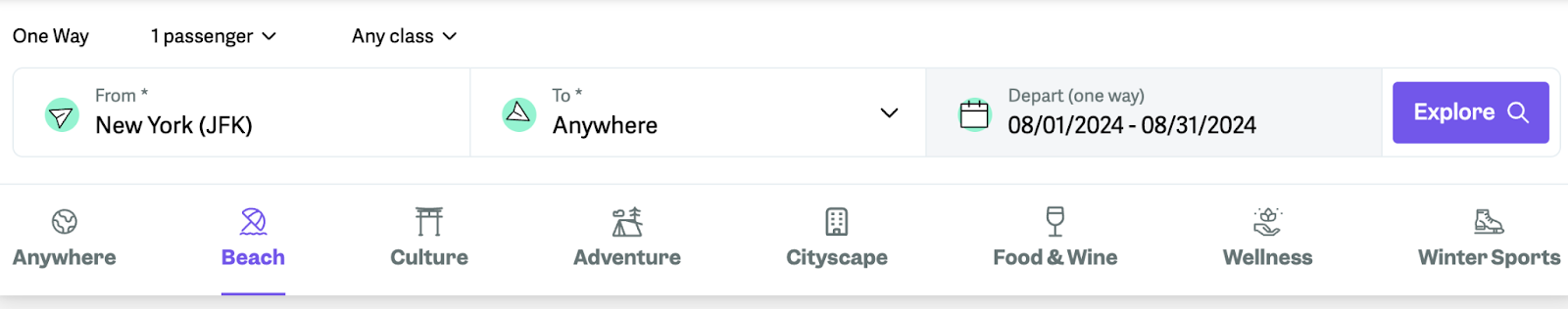 Let’s say you want to visit a destination known for its beaches; in that case, you’ll select the “Beach” icon. (If you're not sure where you want to go, “Anywhere” will show you available flight awards around the globe.)