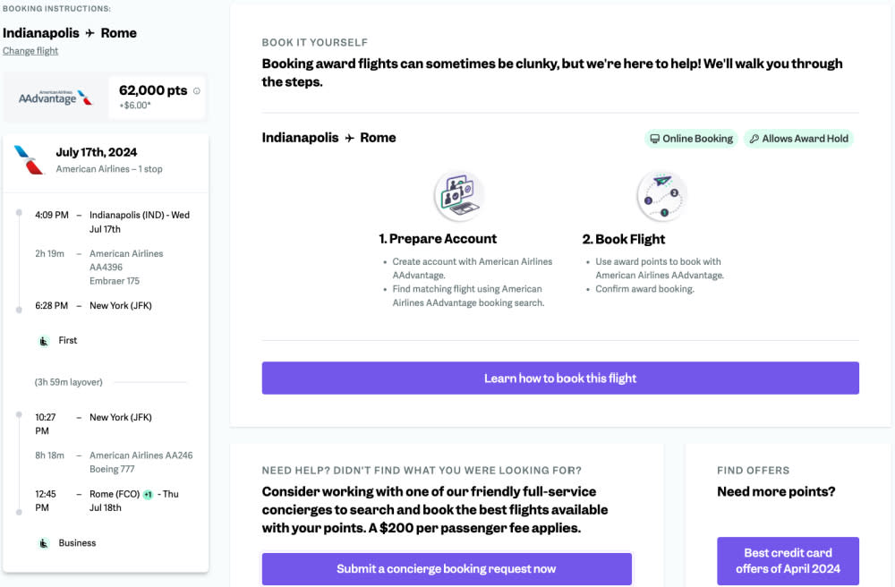 For example, let’s say you want to fly your friend from Indianapolis (IND) to Rome (FCO) in business class this summer. point.me immediately locates the best option — a 62,000-mile sweetheart deal on American Airlines. This seat costs thousands of dollars otherwise!