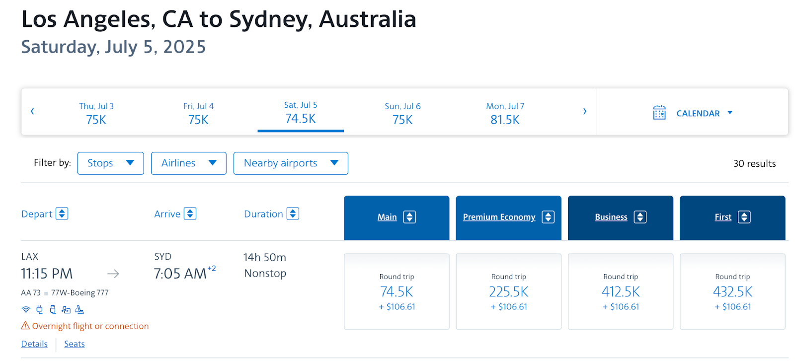 If you want to fly first class from the U.S. to Australia, American Airlines might be your best option. You can fly round trip from Los Angeles to Sydney in first class starting at 110,000 miles. However, award pricing is variable, so you may see some fares for 432,500 miles one way, plus $106.61 in taxes and fees. A premium economy ticket can also provide great value at 130,000 miles round-trip if you want a little extra comfort without spending all of your miles on one trip.