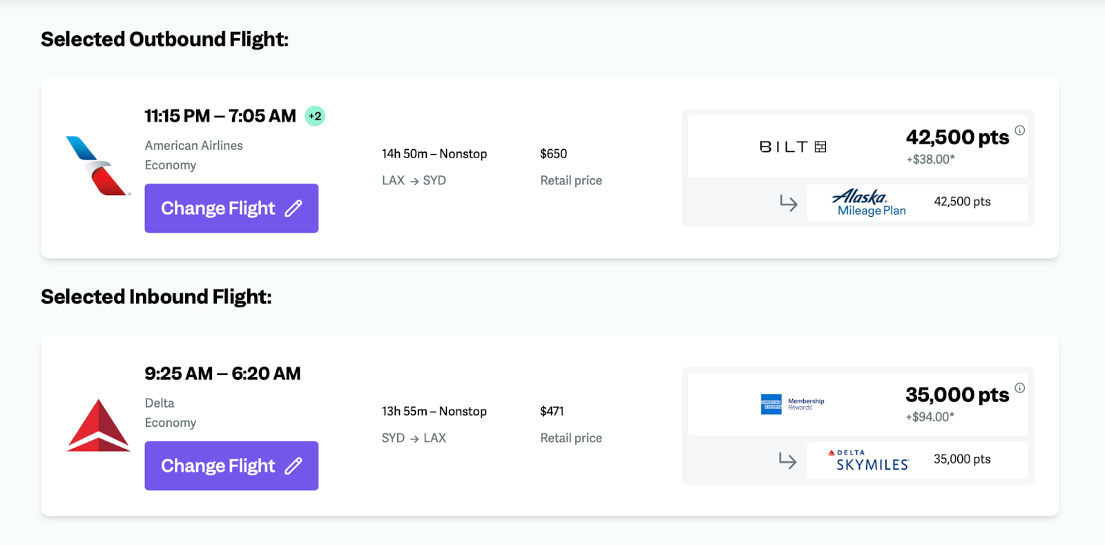 One of the best features is that you can mix and match loyalty programs for your outbound and inbound flights. Using this example, I’d fly American Airlines from Los Angeles to Sydney and Delta Air Lines from Sydney back to Los Angeles.