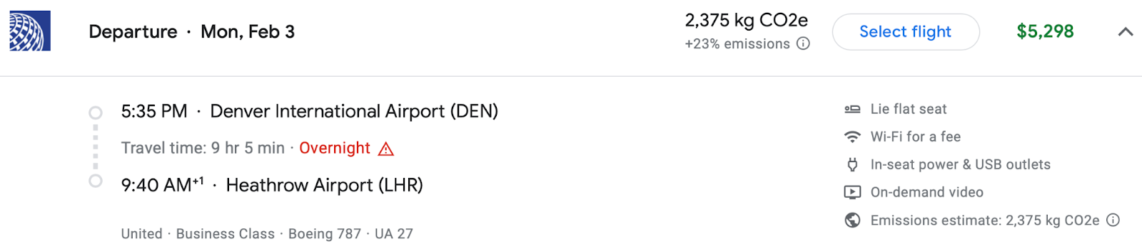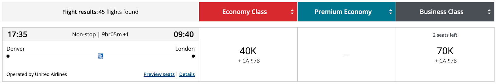 For example, here’s a one-way flight from Denver (DEN) to London (LHR), which costs 70,000 Aeroplan points in business class.