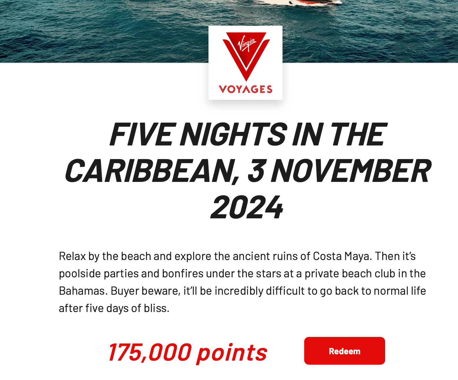 Another great way to redeem your miles is for a cruise. A few times per year, Virgin Red has a promotion allowing you to redeem points for one of their Virgin Voyages cruises.