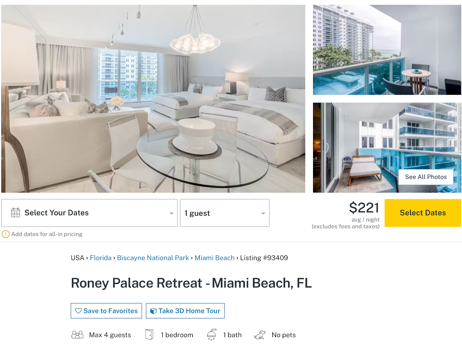 Here’s an example of a condo in Miami Beach located steps from the ocean. It sleeps up to four guests and averages $221 per night, not including taxes and fees.