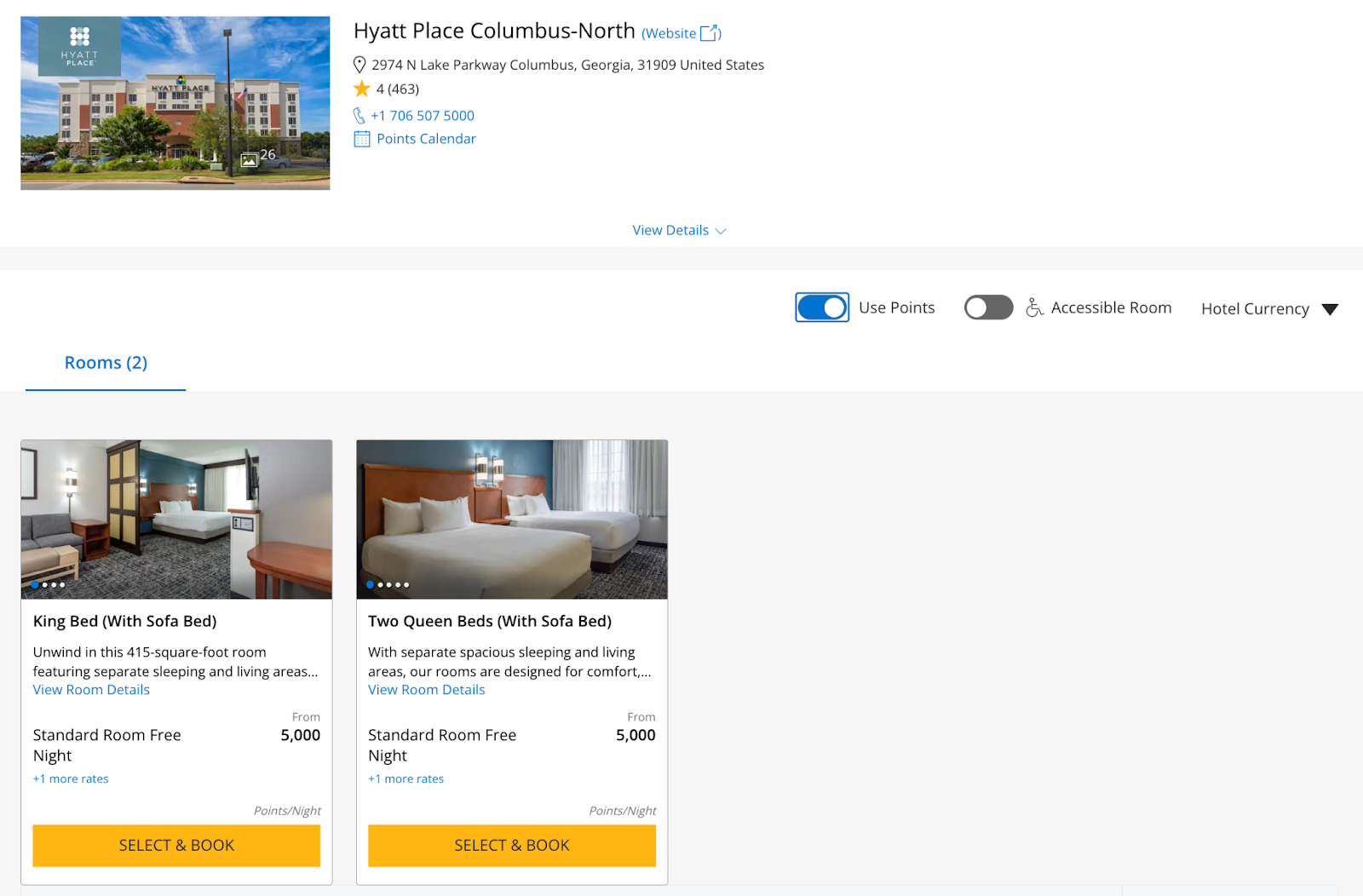 What about closer to home? If you have a family member at Fort Benning in Georgia, you might be visiting and need a hotel room. Rates at the Hyatt Place Columbus-North cost over $140 with taxes on most nights, but you can redeem just 5,000 points here most nights.