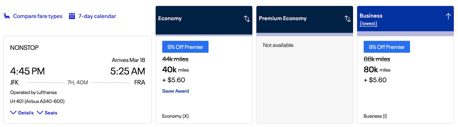 But it’s also possible to use points at the opposite end of the spectrum. Consider this Lufthansa business class seat, flying from New York City to Frankfurt, Germany. The flight sells for $3,132. However, you could redeem 80,000-88,000 United Airlines miles instead, depending on whether you have a United Airlines credit card or elite status with the airline to get the lower number.