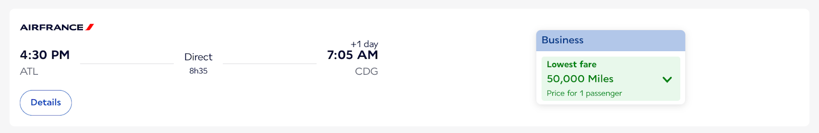 If you want an even better number, transfer 50,000 points to Flying Blue, the joint program of Air France and KLM. You can book a business-class seat to Europe from the U.S. for just 50,000 miles, plus about $230 in taxes and fees.