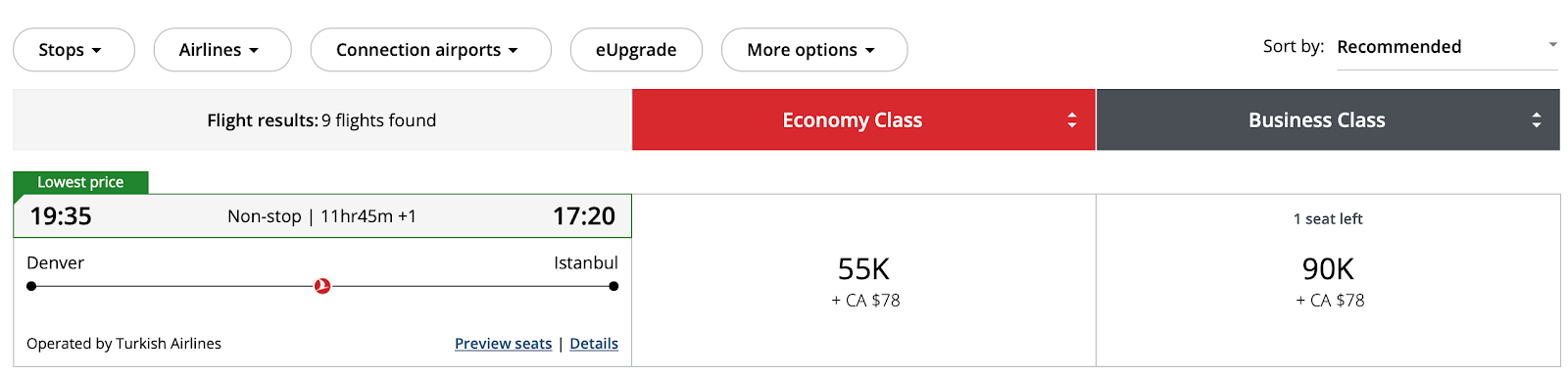Here's an example of a one-way flight from Denver (DEN) to Istanbul (IST) with Air Canada Aeroplan, a Star Alliance partner. As you can see, Air Canada is going to charge you 90,000 Aeroplan points to book a business-class seat.