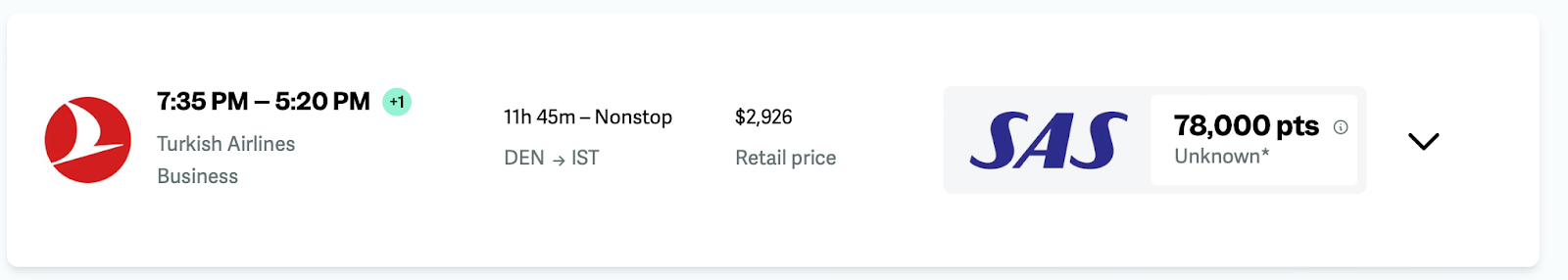 But when you click over to point.me and check your options, you’ll see that the exact same flight is also bookable via SAS — for just 78,000 miles.