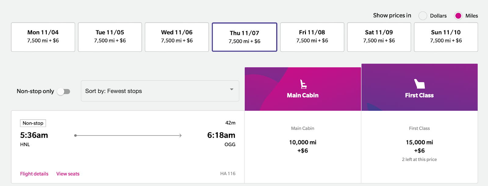 Intra-Hawaii flights are probably the best sweet spot for using HawaiianMiles, as they start at just 6,375 miles one way. Otherwise, you can redeem as little as 40,000 miles one way for a first-class flight from Hawaii to the mainland.