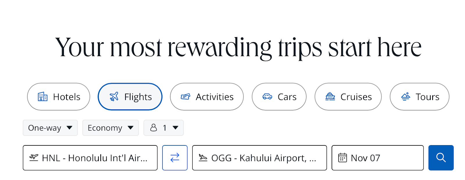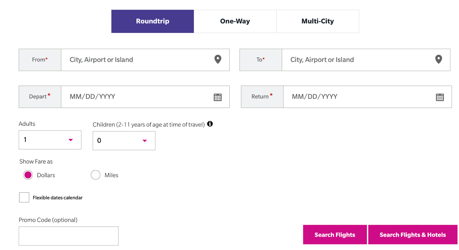 Then, you can input your search information, including where you’d like to go and when. Then, hit the “‘search flights” button.