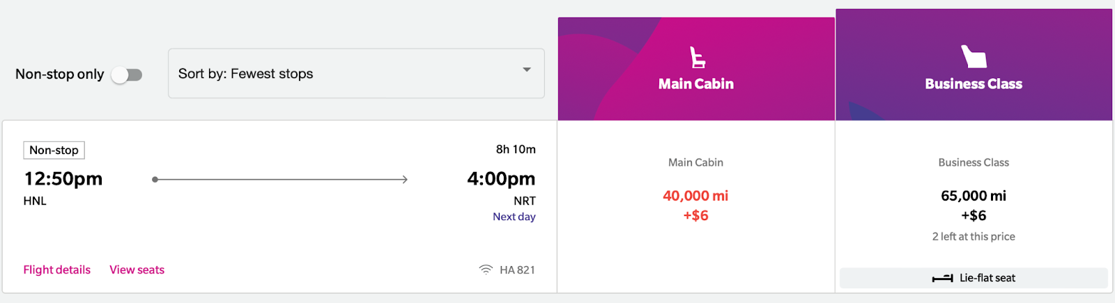 Some of the best ways to redeem your HawaiianMiles is for flights across the Pacific. For example, you can pay just 65,000 miles one-way for a business-class flight from Honolulu to Tokyo.