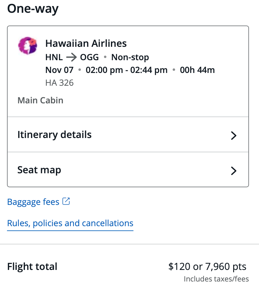 In this example, you’d pay 7,960 Chase Ultimate Rewards for a $120 flight. The same award flight would cost 7,500 Hawaiian miles (or 6,375 for a discounted award). So, booking your Hawaiian flight through the Chase Travel portal in this scenario is not a good idea.