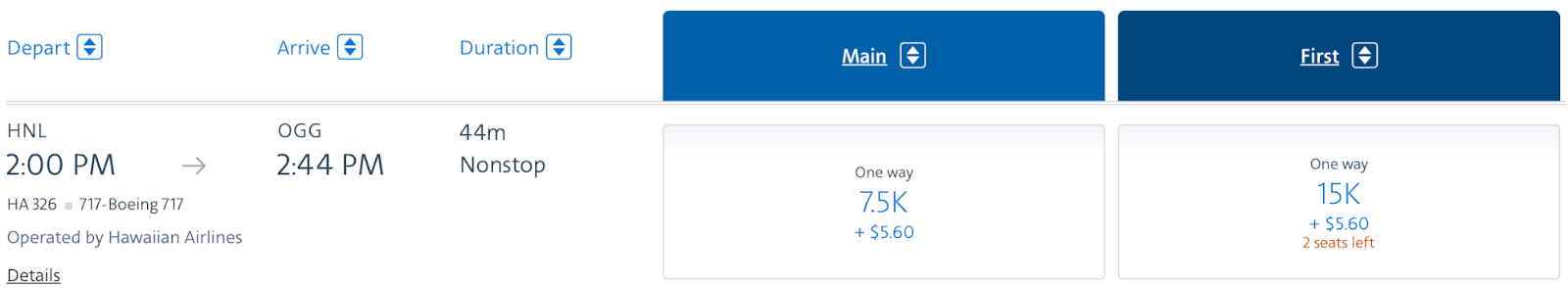 The cheapest award flights you’ll find will be intra-Hawaii flights, which can cost as little as 7,500 miles one-way. Sometimes, these awards are discounted to 6,375 miles