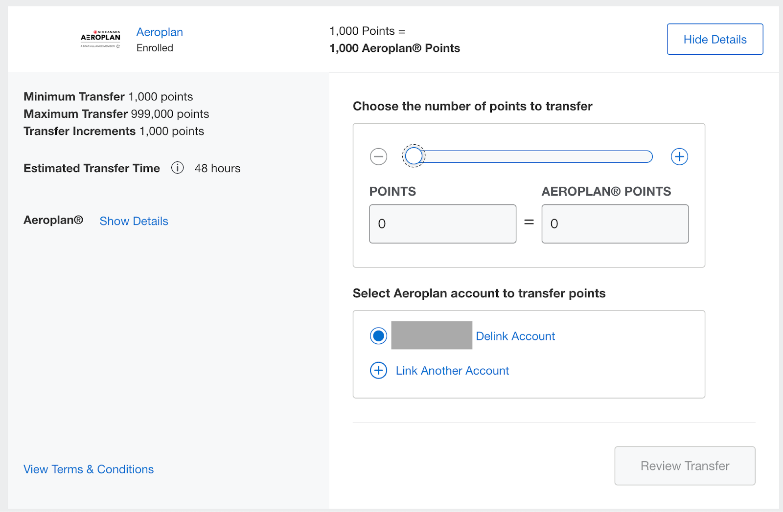 If there’s a transfer bonus active, identify the total points needed, subtract any existing balance, and divide the remaining amount by 1 plus the bonus percentage as a decimal (e.g., for a 20% bonus, divide by 1.2). Round up to the nearest 1,000 points. For example, needing 210,000 Aeroplan points with a 20% bonus and an existing balance of 1,200 points, you would transfer 174,000 points, which would become 208,800 points with the bonus, combined with the existing points to meet the requirement. (Too much math? point.me’s search will do it for you and tell you the total points needed taking the transfer bonus into account.)