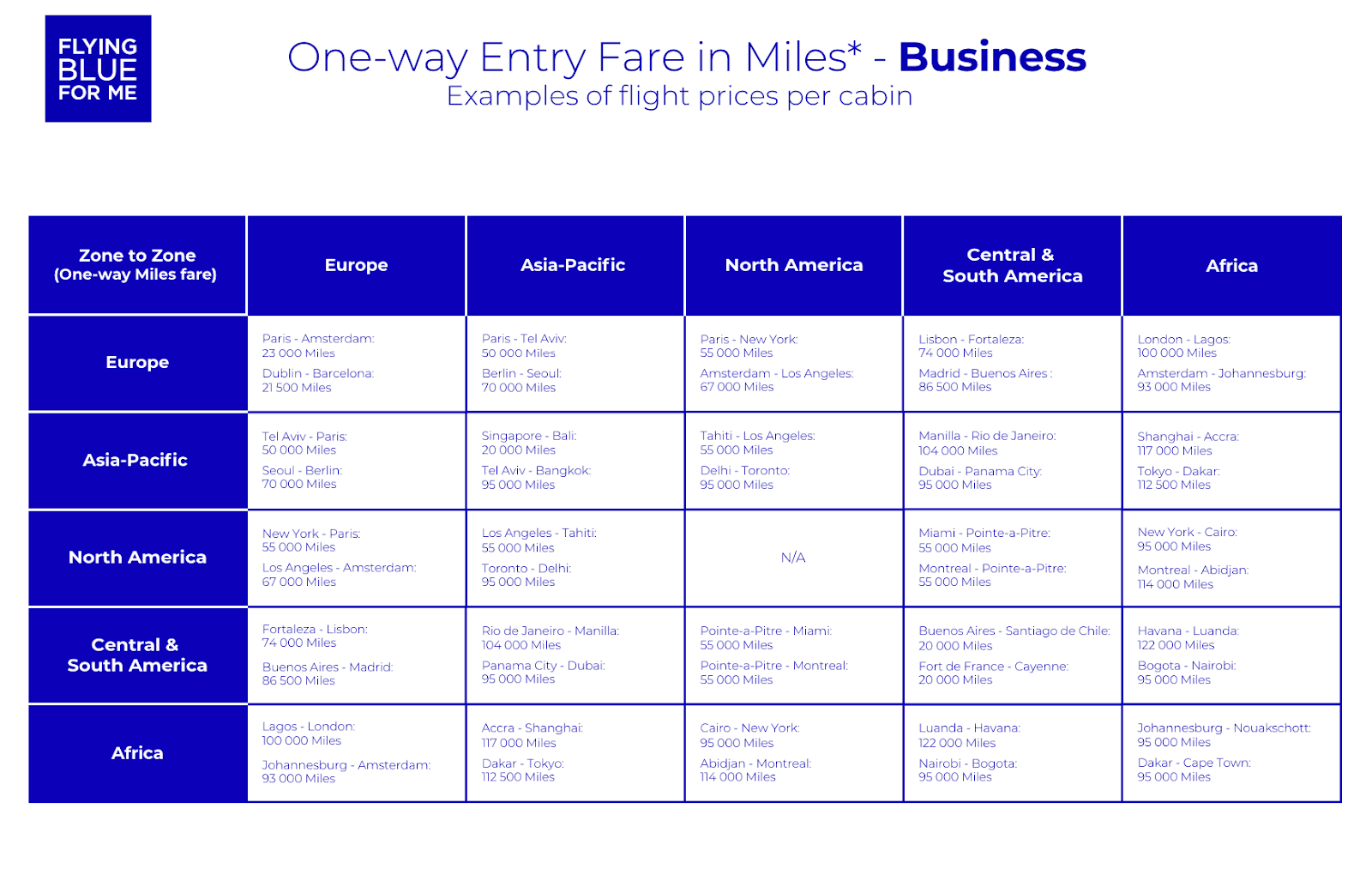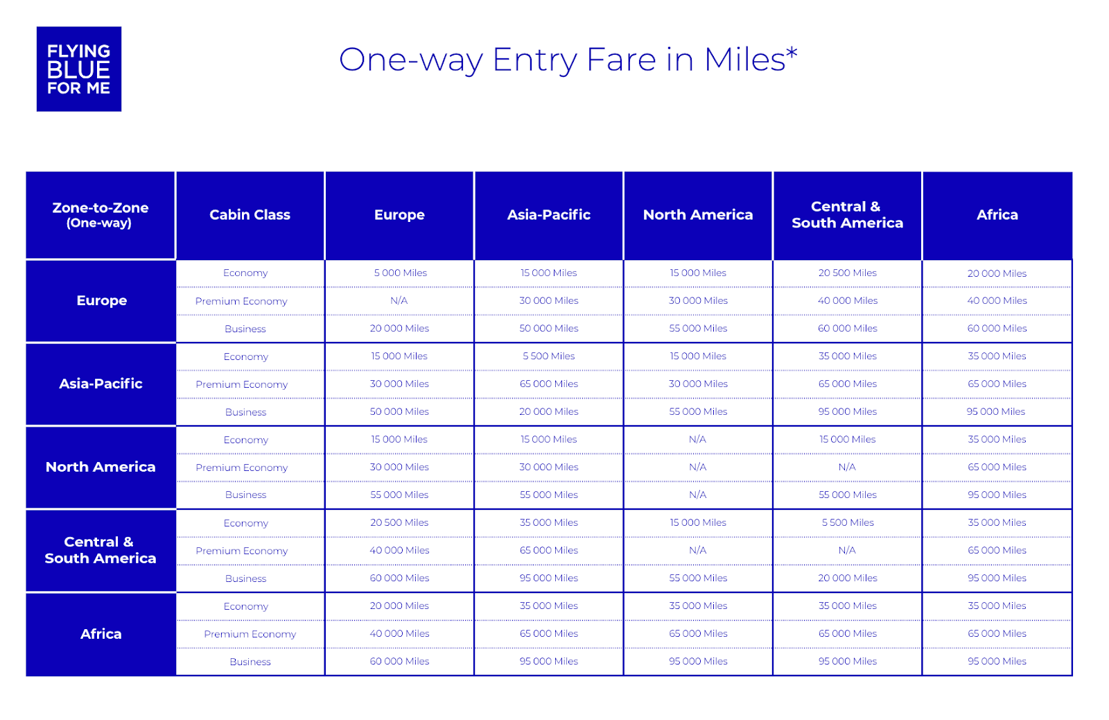 A free flight on Air France-KLM can be as low as 5,000 Flying Blue miles. From the U.S., expect to spend at least 15,000 points for a one-way flight in economy and 50,000 points for business class.