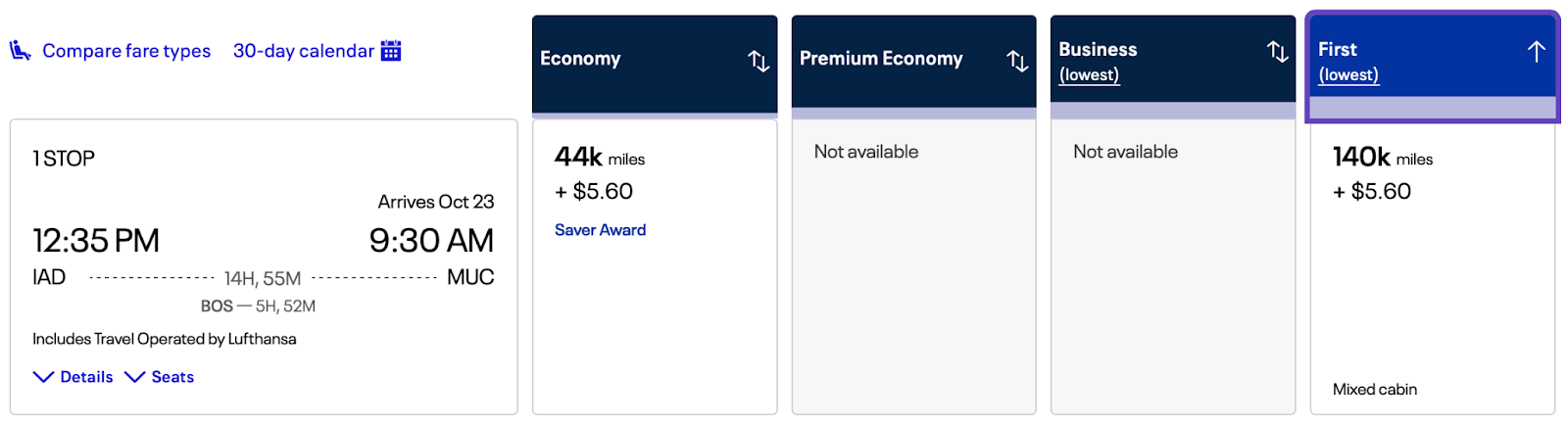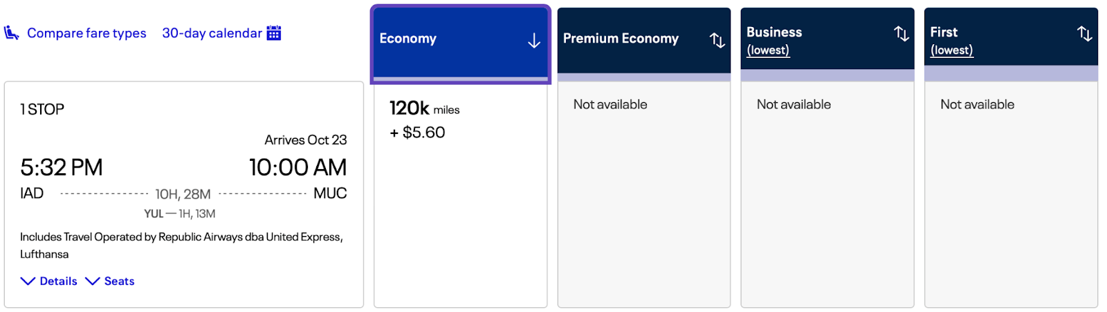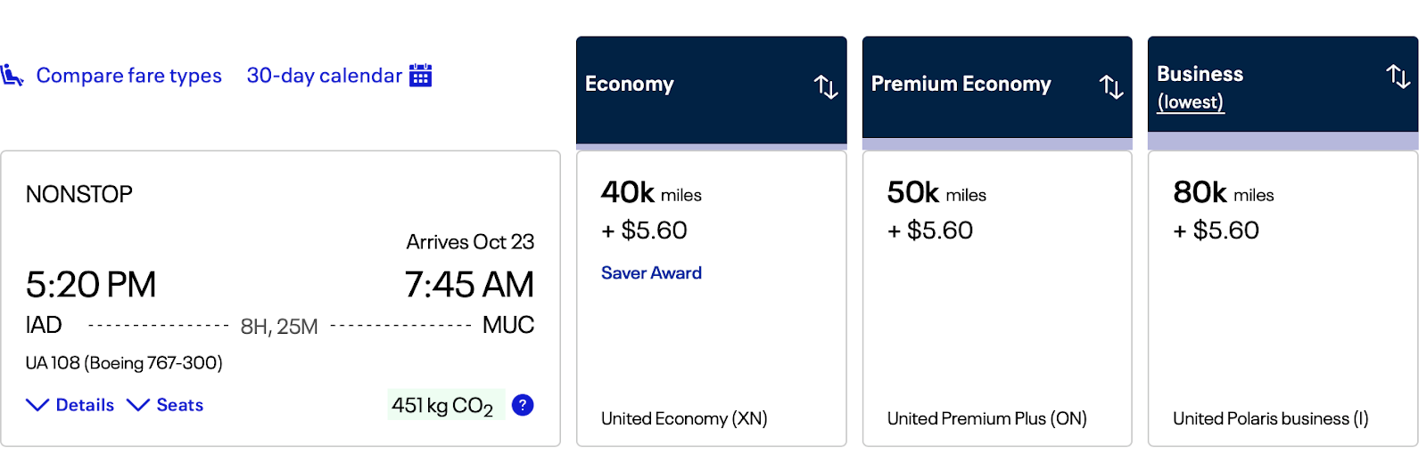 In the section above, we showed you a saver economy award from Washington D.C. (IAD) to Munich (MUC) for 40,000 United miles. This flight is operated by United.