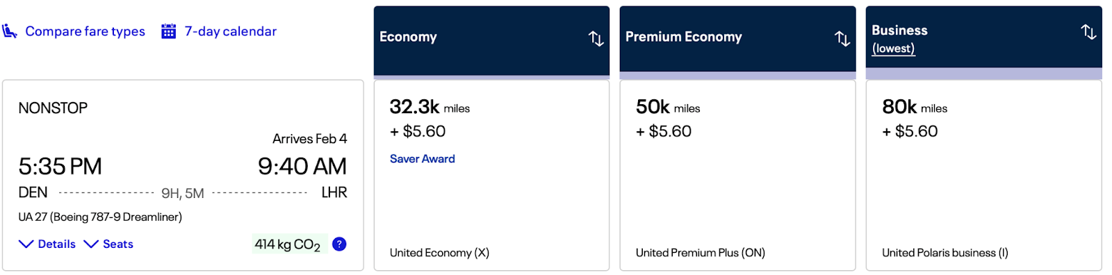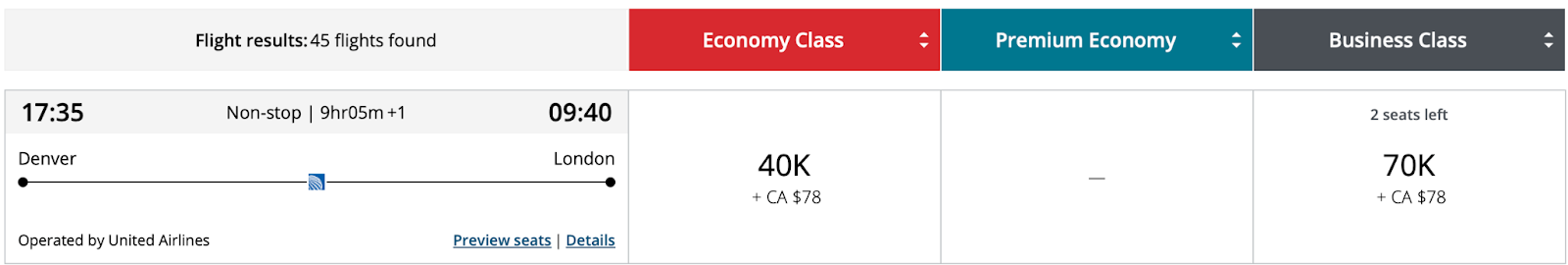 Here’s an example of a flight from Denver (DEN) to London (LHR) with United. A one-way business class ticket will cost 80,000 miles.