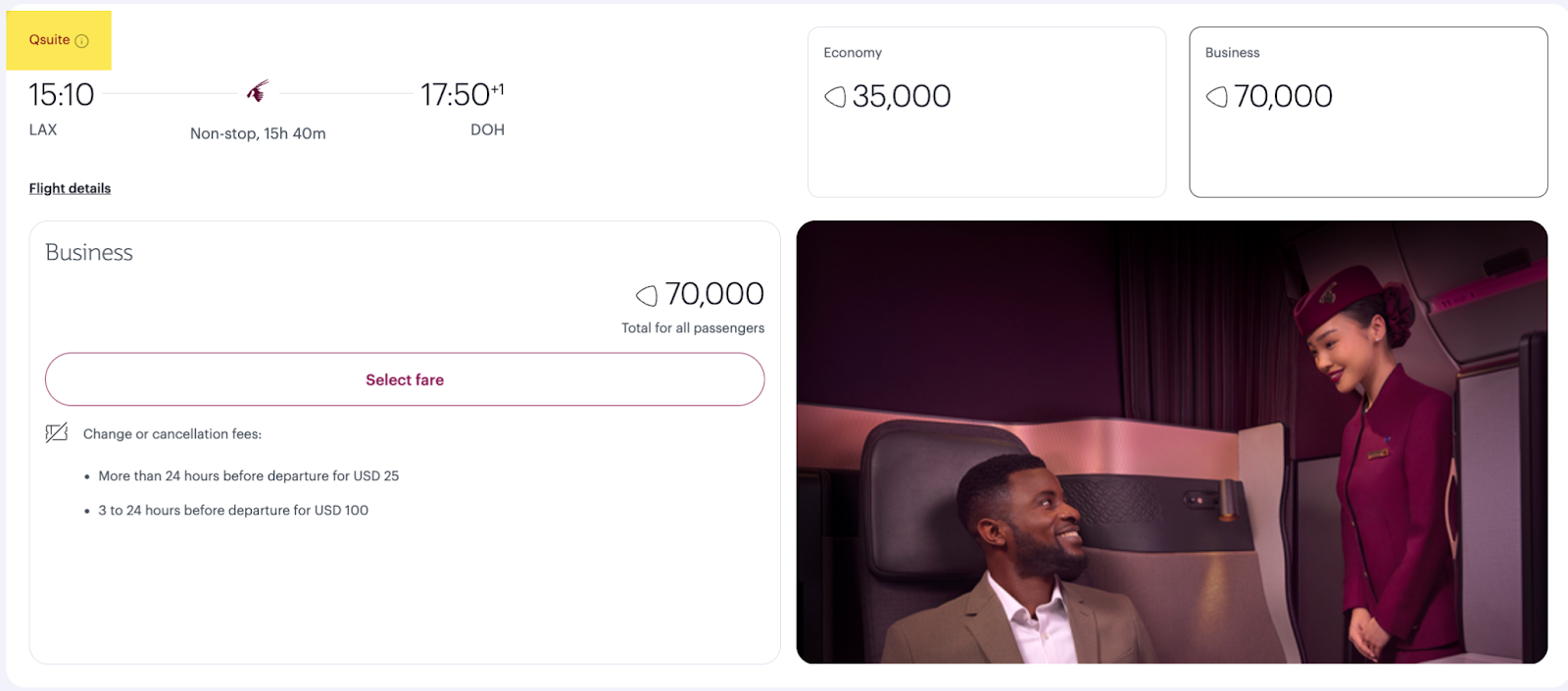 Unless you’ve got an innumerable number of travel rewards, this is an unwise redemption method. The upside is that you don’t have to rely on Qatar Airways award availability — if a business class seat is for sale, you should be able to book it through your bank portal.
