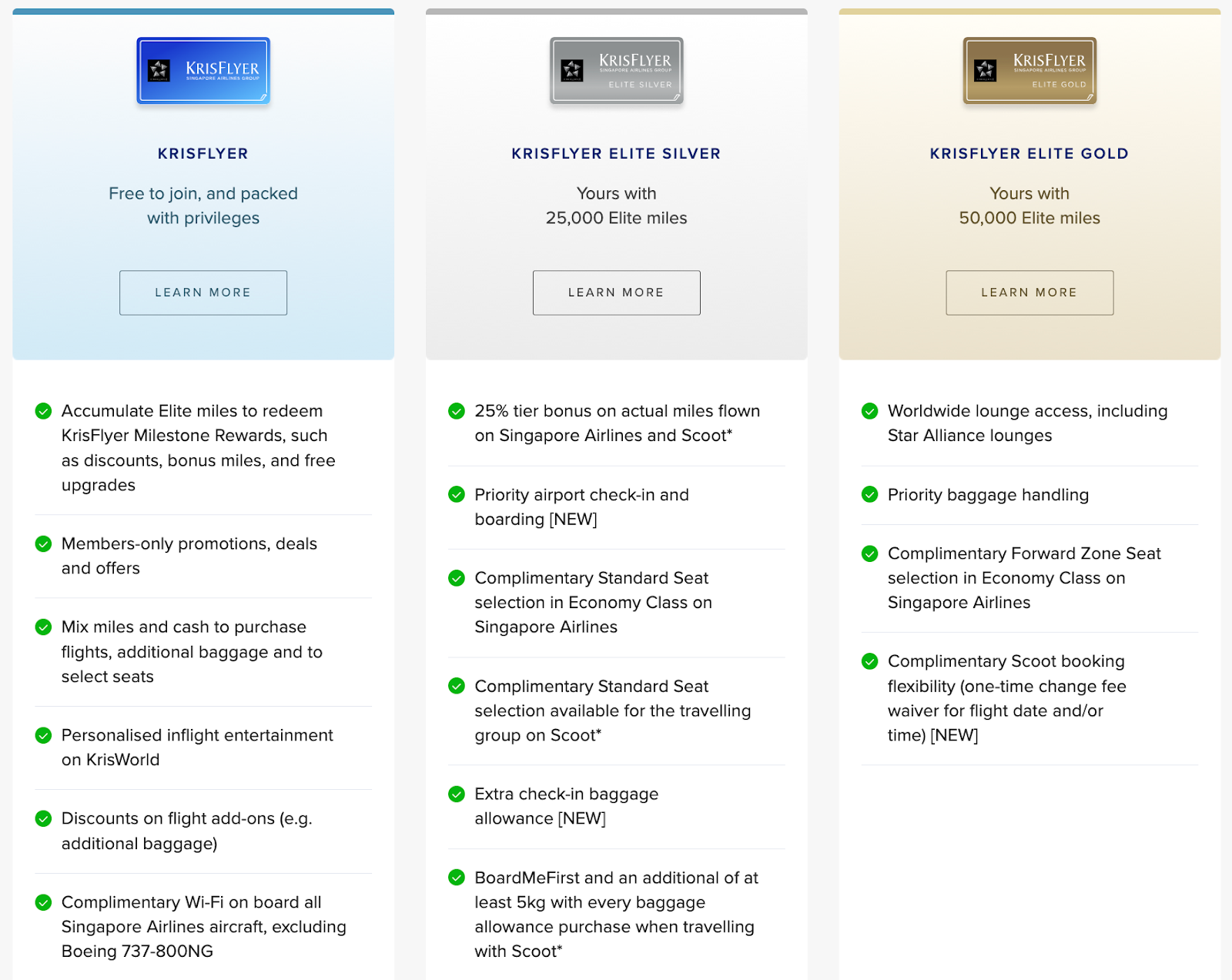 Benefits at this tier include priority airport check-in, a 25% tier bonus on miles flown with Singapore Airlines and Scoot, complimentary seat selection on Singapore Airlines and Scoot flights, and extra checked baggage allowance.