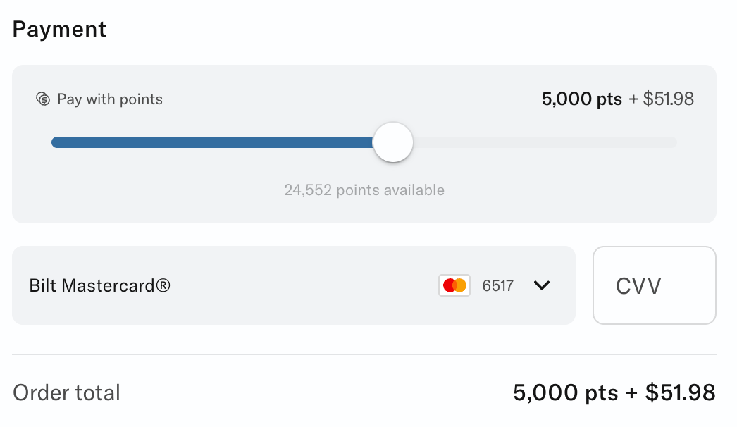 In the “Payment” section, you can toggle the slider to choose how many points you want to put toward your flight redemption. You can use them all or just a portion. To use all your points, slide it all the way to the right. Here’s what it looks like if I just want to redeem 5,000 Bilt points and pay the remaining $51.98 in cash, for example.