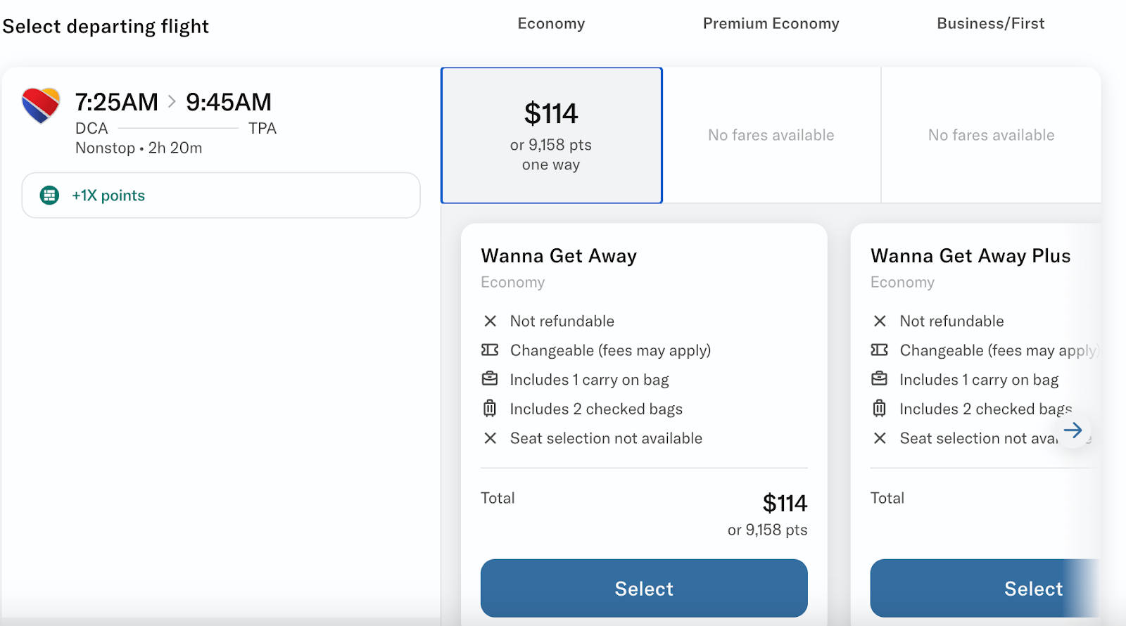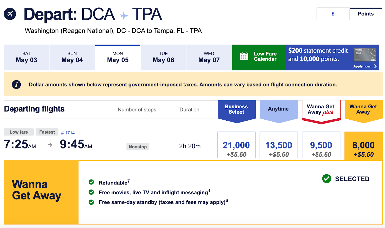 For this example, let’s find a one-way Southwest Airlines flight from Washington, D.C. (DCA) to Tampa (TPA) in early May. The results page, pictured below, shows a brief overview of all available points and miles options, plus the cash rates, to compare.