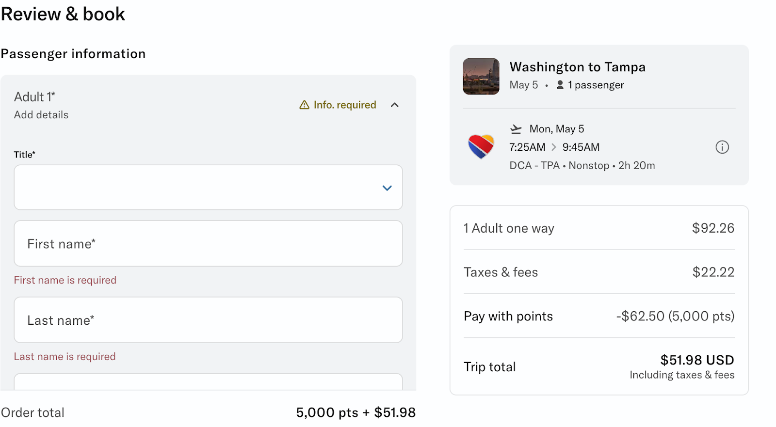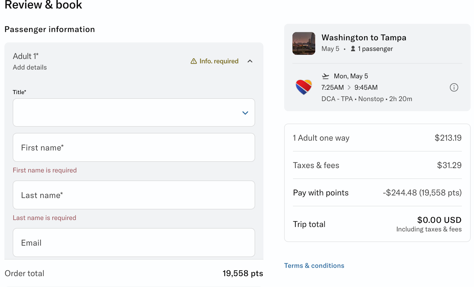 The remaining balance will be calculated for you to pay in cash and outlined on the top right portion of the screen. Once you’ve filled out the rest of your passenger and billing information, press the “Complete booking” button to finalize your purchase.