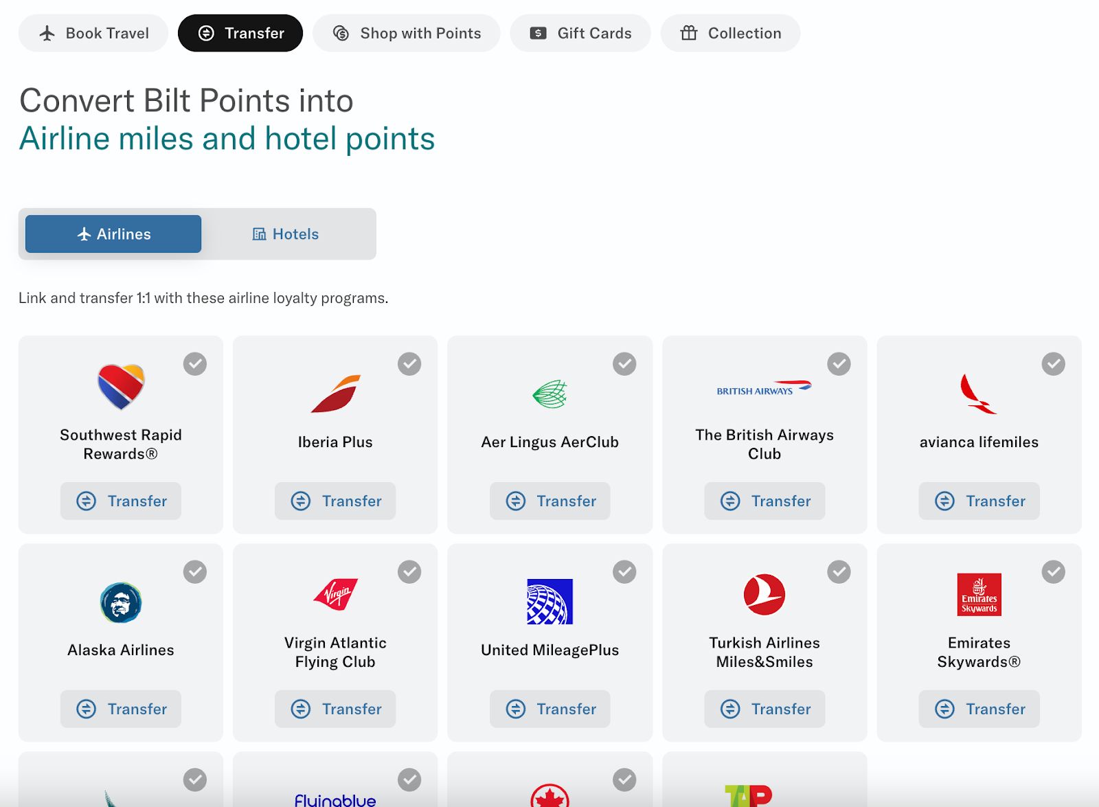In addition to Southwest Airlines, Bilt Rewards partners with 14 other carriers that accept transfers of Bilt points. They include Alaska Airlines, Avianca Lifemiles, United MileagePlus, Air France/KLM Flying Blue, Virgin Red (Virgin Atlantic Flying Club), Emirates Skywards, British Airways Executive Club, Cathay Pacific Asia Miles, Iberia Plus, Turkish Airlines Miles&Smiles, JAL Mileage Bank, Qatar Airways Privilge Club, Aer Lingus AerClub, Air Canada Aeroplan, and TAP Miles&Go.