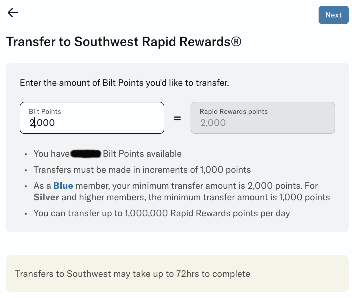 For this example, let’s try converting 2,000 Bilt points to Southwest. Simply enter the number of points you want to transfer and click “Next” in the top right corner to continue.