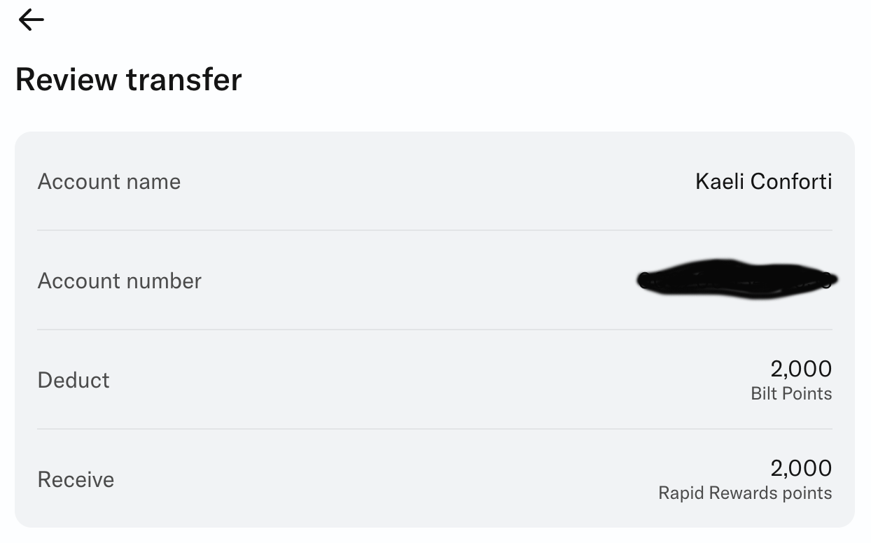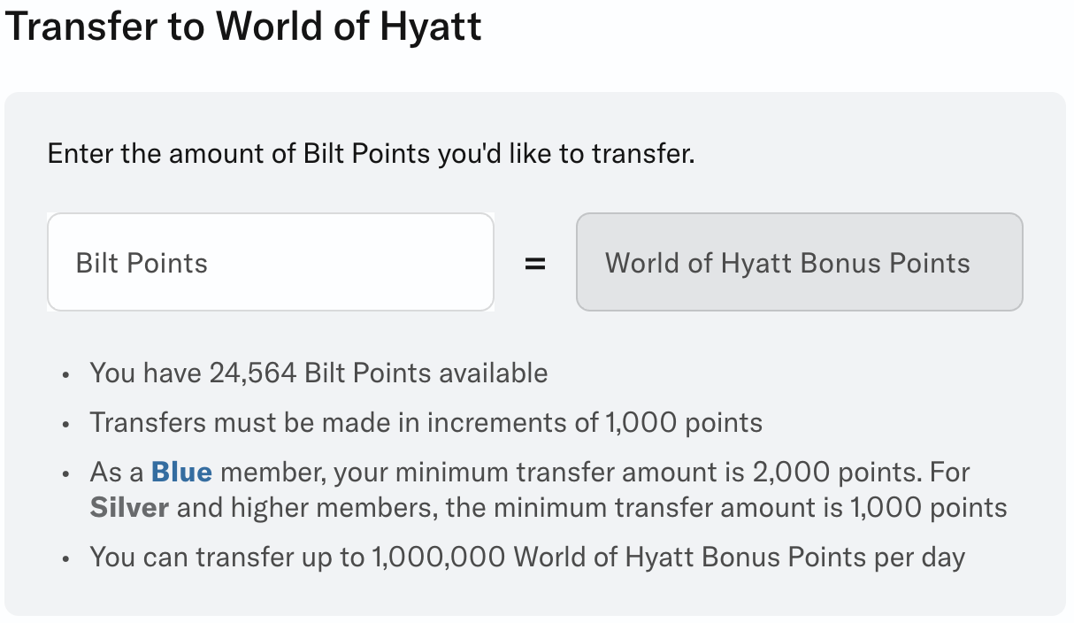 The next page shows a recap of your points total and any rules regarding the conversion process. Points must be transferred in increments of 1,000 and there are certain minimum transfers to note depending on your Bilt status: You must transfer at least 2,000 points as a Bilt Blue member or at least 1,000 points with Silver status or higher.