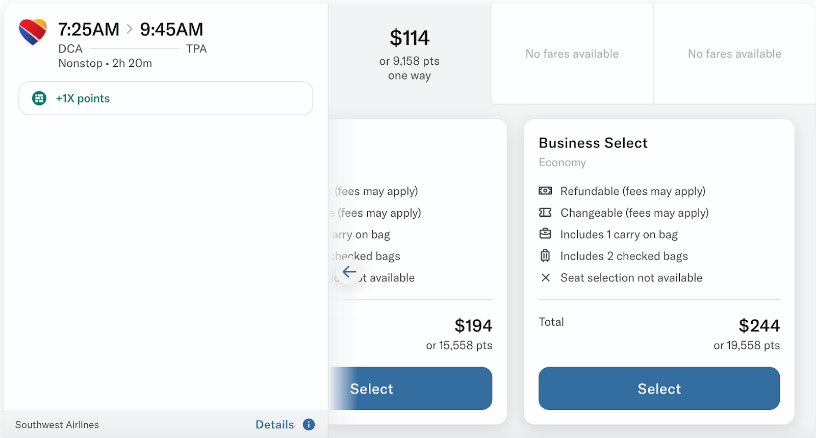 By scrolling to the right, you can also see how much other Southwest fares cost. Wanna Get Away Plus tickets are available for $134 or 10,759 points, while Anytime tickets will run you $194 or 15,558 points, and Business Select tickets cost $244 or 19,558 points.