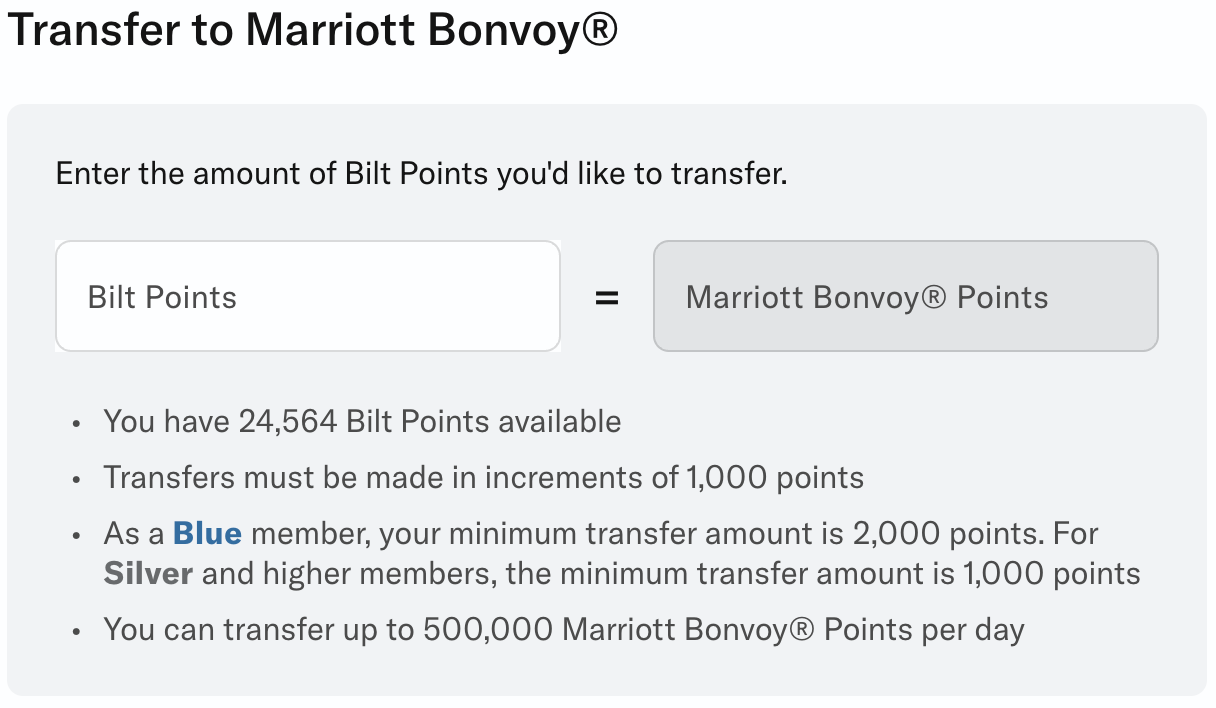 From here, click on the “Transfer” button under Marriott Bonvoy. The next page will ask how many Bilt points you’d like to transfer (in 1,000-point increments, up to 500,000 per day) and list any minimum transfer requirements (1,000 for Bilt Silver status and higher or 2,000 for Bilt Blue members).