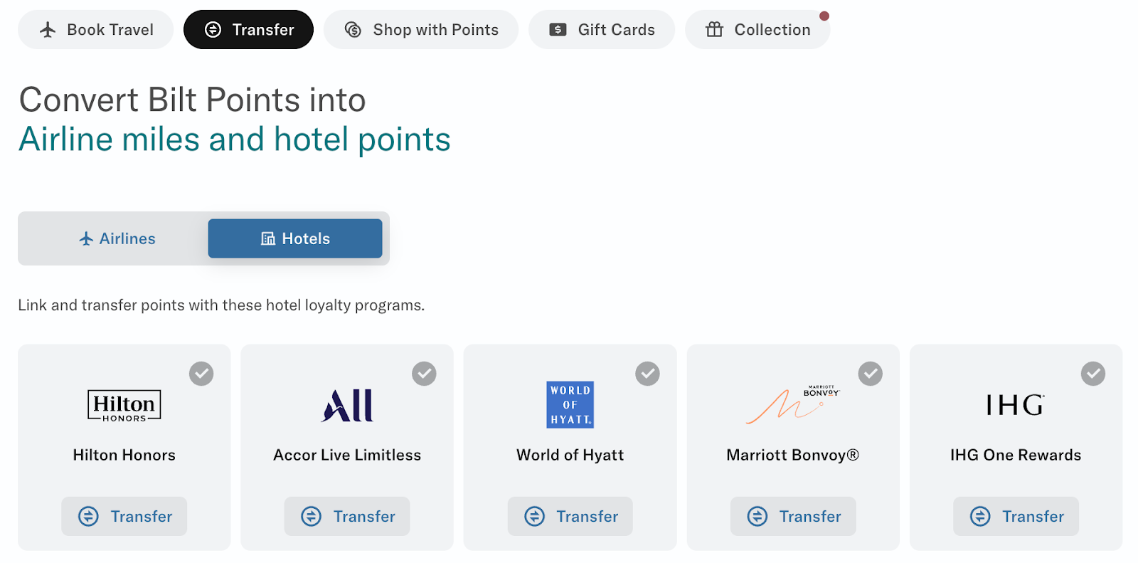 When you’re ready to transfer your Bilt points, choose ”Rewards,” then “Transfer” from the tabs at the top of the page. Lastly, select “Hotels” to bring up the list of available partners.