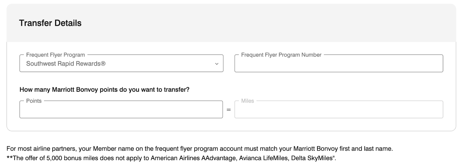 Next, choose Southwest Rapid Rewards from the Frequent Flyer Program drop-down menu, and enter your membership number and how many points you want to transfer. Marriott points transfer to Southwest at a 3:1 ratio, with an extra 5,000 points for every 60,000 transferred.