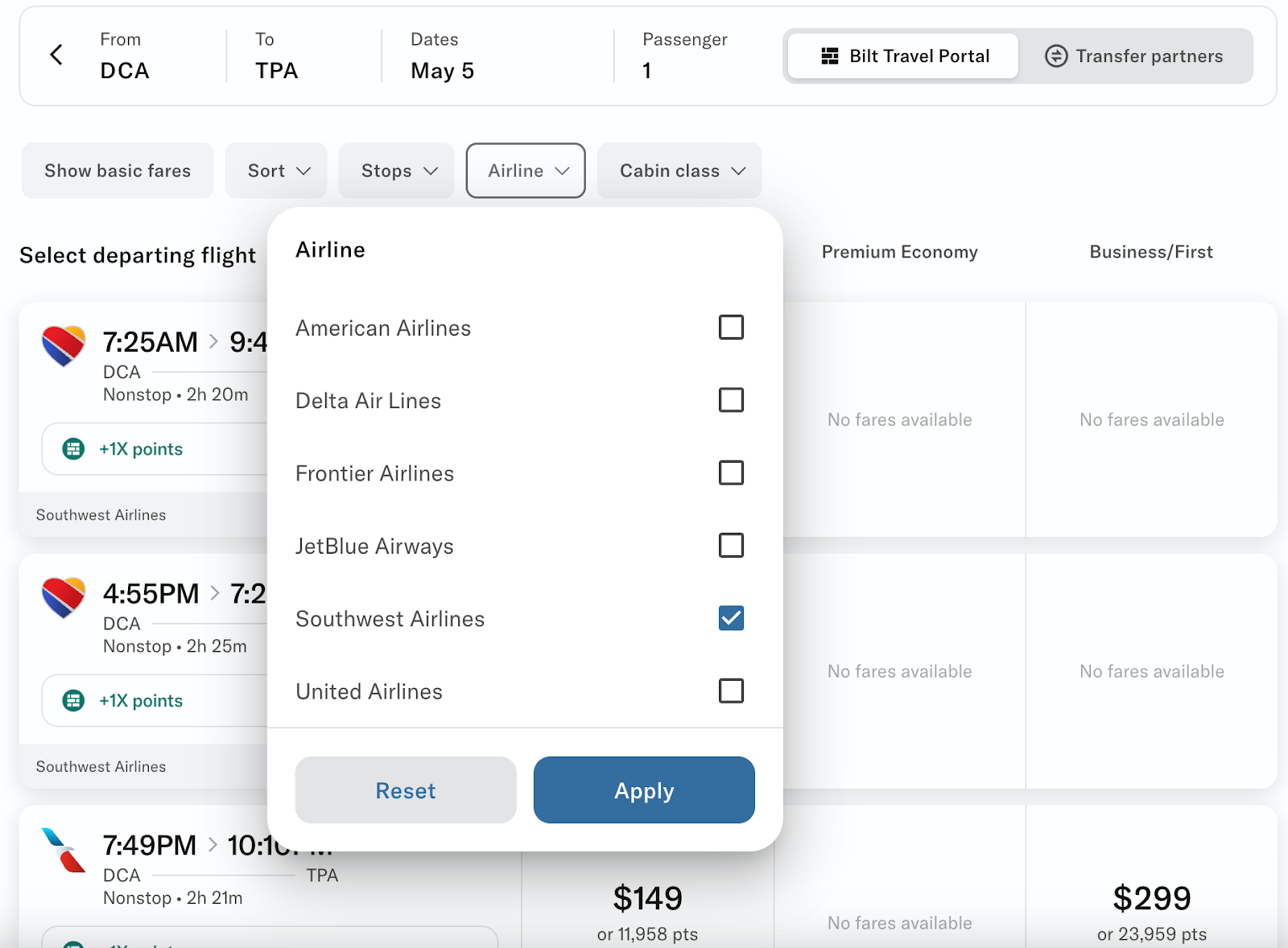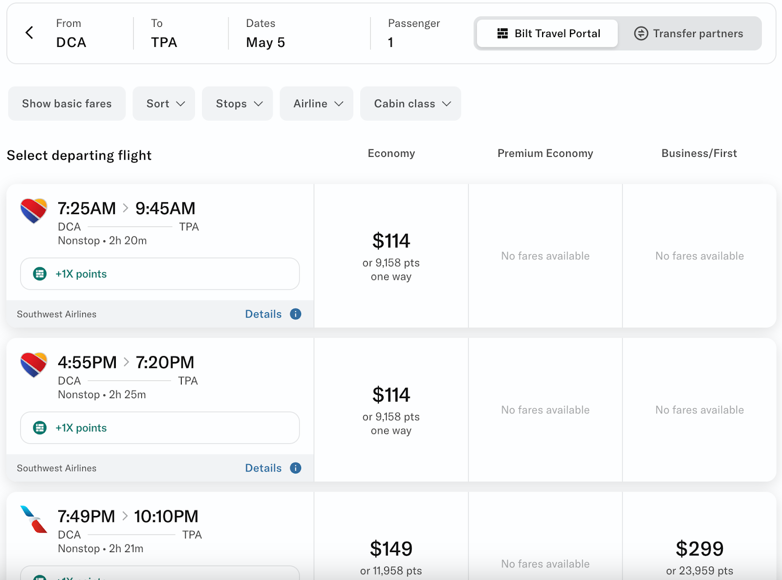 You can also use the Bilt Travel Portal to redeem points for flights on Southwest. It’s a pretty straightforward process, but since Bilt points have a fixed redemption rate of 1.25 cents per point, you might end up getting slightly less value than you would if you transferred points directly to Southwest at a 1:1 ratio. Still, it’s worth comparing your options as you may end up finding some good deals via the portal.