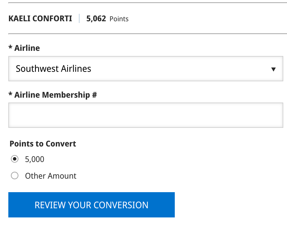Just beneath that is where you can choose Southwest Airlines for the transfer, enter your membership number, and select how many points you wish to transfer. Click “Review your conversion” to continue.