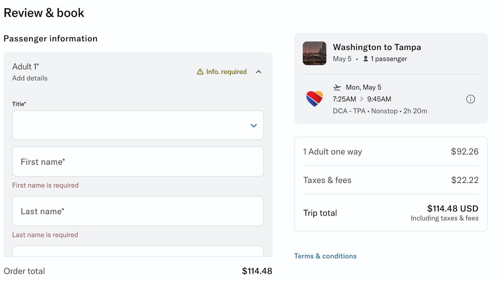 Let’s choose the Wanna Get Away ticket for $114 or 9,158 points. The final booking page rings up your total price in cash, but if you want to pay with points, scroll down.